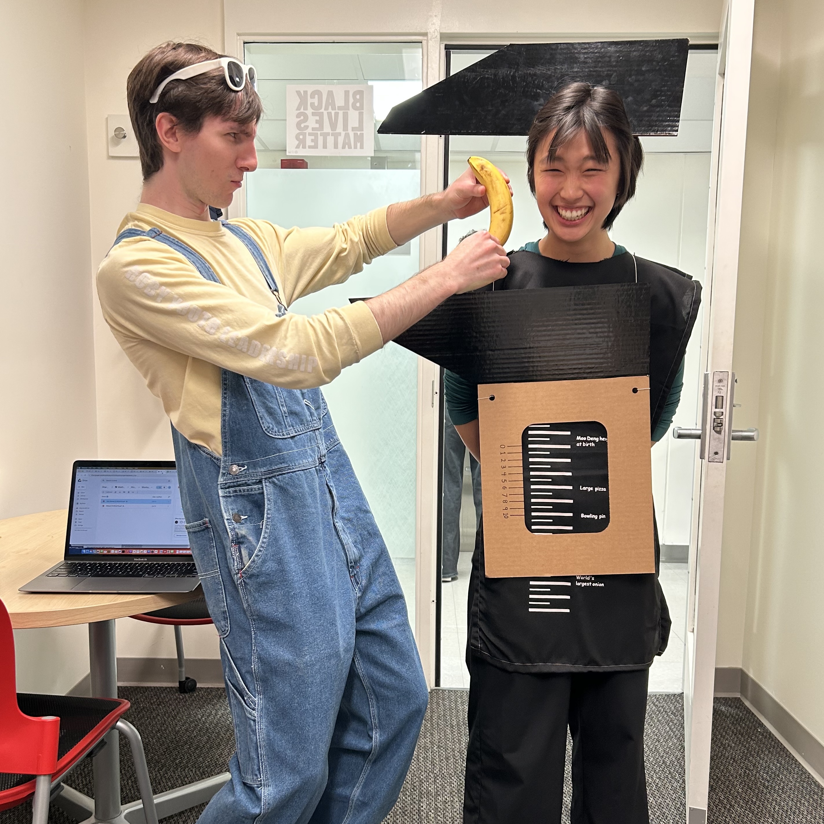 It started as a joke ("we're always losing track of our calipers... why don't you just become one?") and turned into one of my most legendary Halloween costumes yet. Featuring incredibly useful measurement markings from "Moo Deng height at birth" to "world's largest onion," these Vernier calipers won't ever leave your sight again!